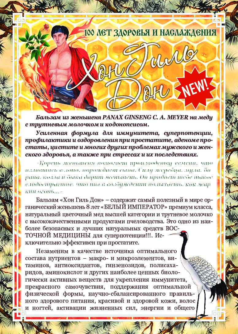 Буклет о медовом бальзаме ХОН ГИЛЬ ДОН — БАЛЬЗАМ ИЗ ЖЕНЬШЕНЯ PANAX GINSENG C.A.MEYER НА МЕДУ С МАТОЧНЫМ МОЛОЧКОМ, КОДОНОПСИСО…