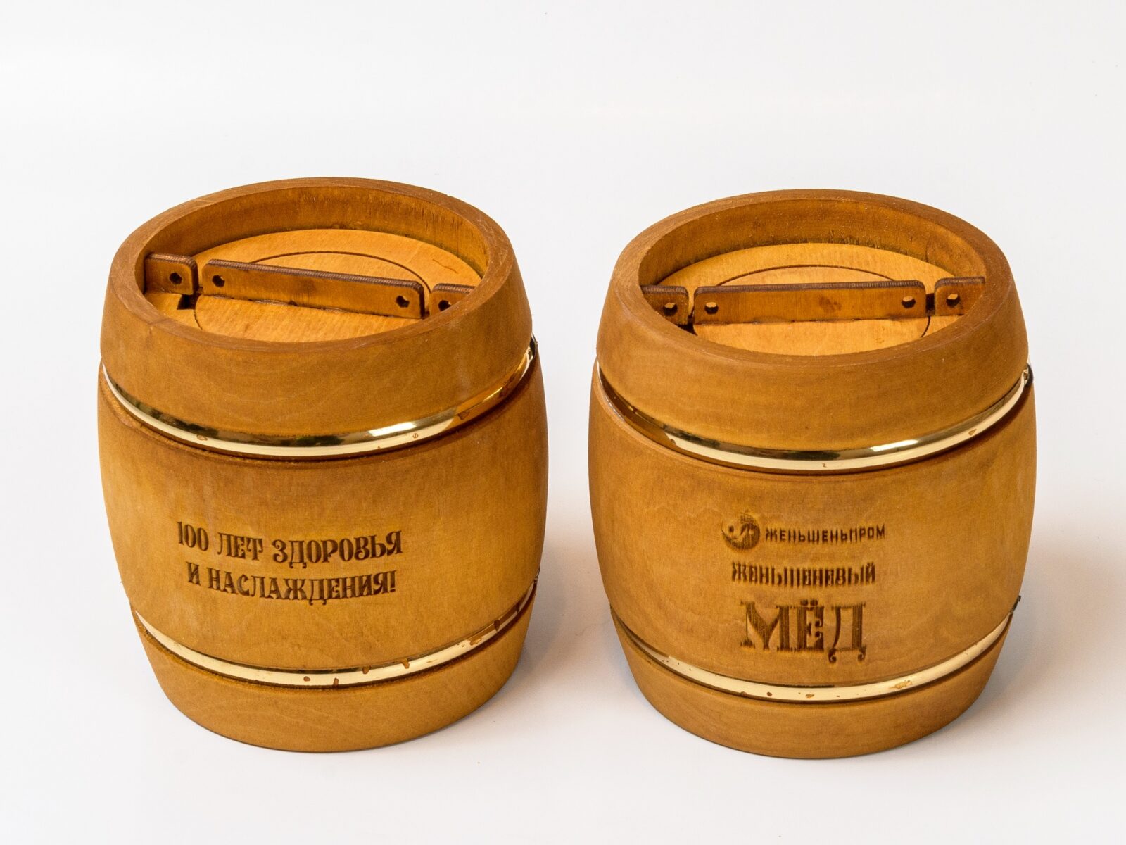 сувенирный бочонок № 6 Бондарь (крышка-защелка) для меда из липы 0.3 Деревянный бочонок из липы для меда с оригинальной надписью, фирменным логотипом и эксклюзивным слоганом — отличный сувенир или подарок, который всегда будет радовать ваш…