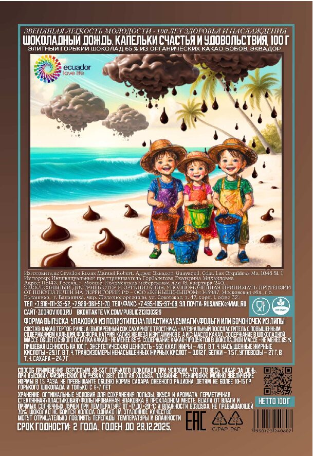 ЭЛИТНЫЙ ГОРЬКИЙ ШОКОЛАД 65 % КАКАО ИЗ ОТБОРНЫХ ОРГАНИЧЕСКИХ КАКАО БОБОВ, ЭКВАДОР