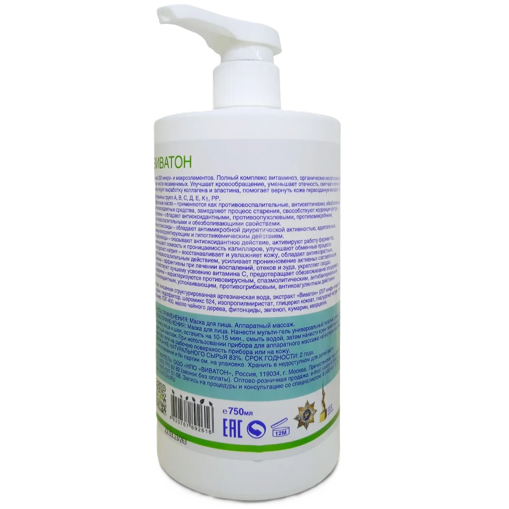 Профессиональное многофункциональное средство в форме легкого желе, предназначенное для комплексного ухода за лицом и телом. Благодаря уникальному сочетанию экстракта «Виватон» и гиалуроната натрия, гель эффективно борется с обезвоживанием, снимает отеки и зуд, а также оказывает выраженное антивозрастное действие. Объем 750 мл идеален как для ежедневных домашних процедур, так и для использования в качестве контактной среды при аппаратном массаже.