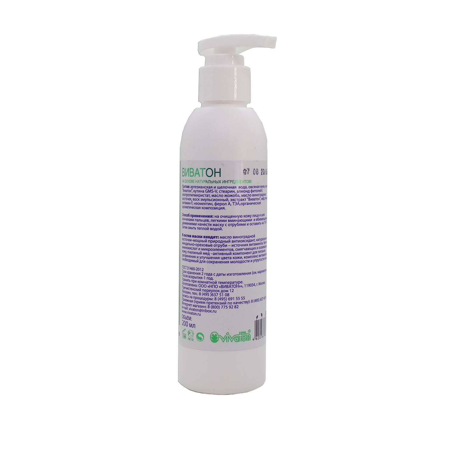 Состав: артезианская вода, стеарин, воск эмульсионный, растительное масло, сбор Виватон – более 100 компонентов, овсяные отруби, глицерил стеарат, масло жожоба, масло виноградных косточек, кедровое масло, мед пчелиный, ферол А, витамин F, лавитол косметический, миндальное масло, натуральная (органическая) ароматическая композиция, коллоидное серебро, экстракт Виватон – 207 компонентов.