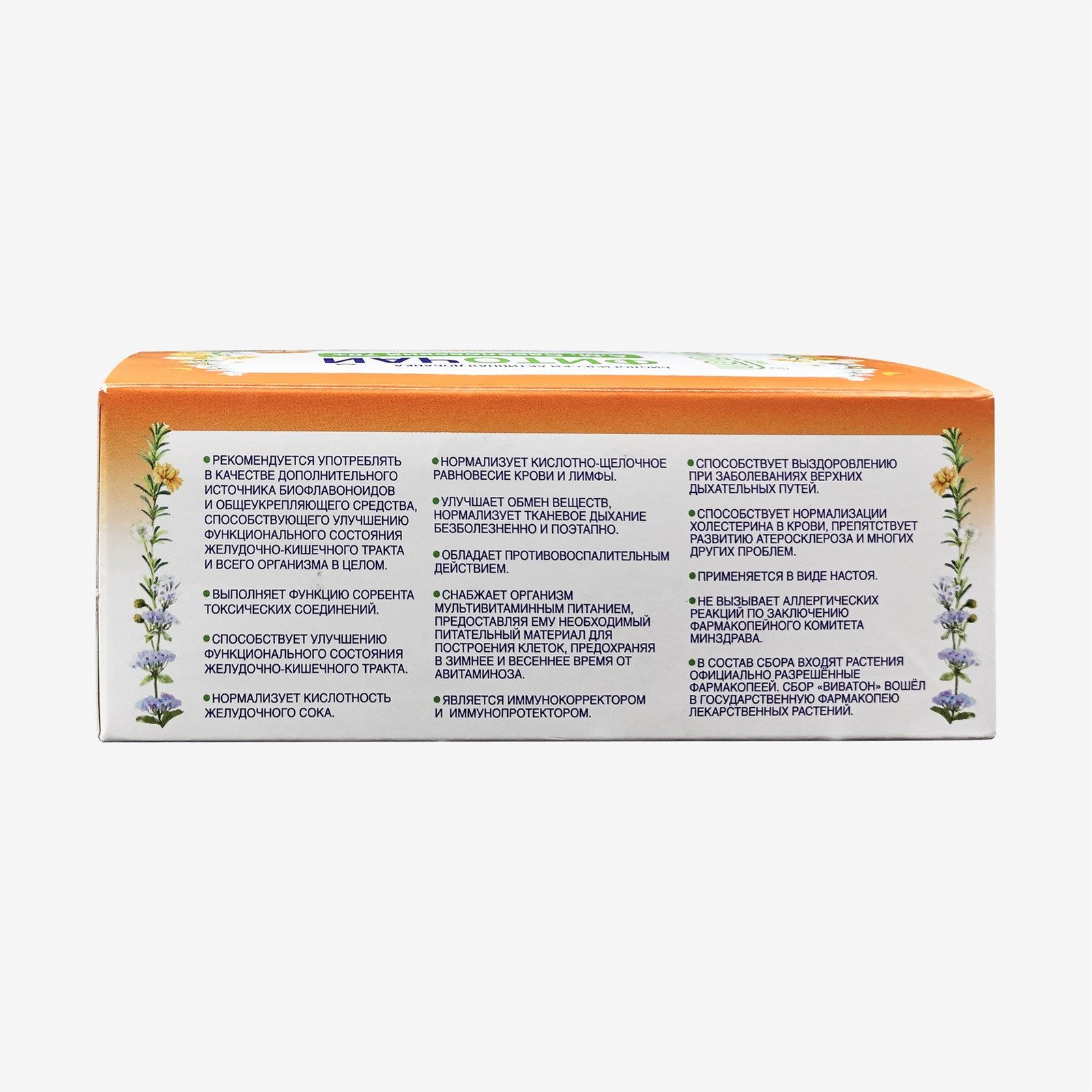 Нормализует кислотно-щелочное равновесие крови и лимфы. Улучшает обмен веществ. нормализует тканевое дыхание безболезненно и поэтапно. Обладает противовоспалительным действием. Снабжает организм мульти-витаминным питанием, предоставляя ему необходимый питательный материал для построения клеток, предохраняя в зимнее и весеннее время от авитаминоза. Является иммунокорректором и иммунопротектором. Способствует выздоровлению при заболеваниях верхних дыхательных путей. Способствует нормализации холестерина в крови, препятствует развитию атеросклероза и многих других проблем. Не вызывает аллергических реакций по заключению фармакопейного комитета Минздрава. В состав сбора входят растения официально разрешенные фармакопеей. Сбор "Виватон" вошел в государственную фармакопею лекарственных средств.