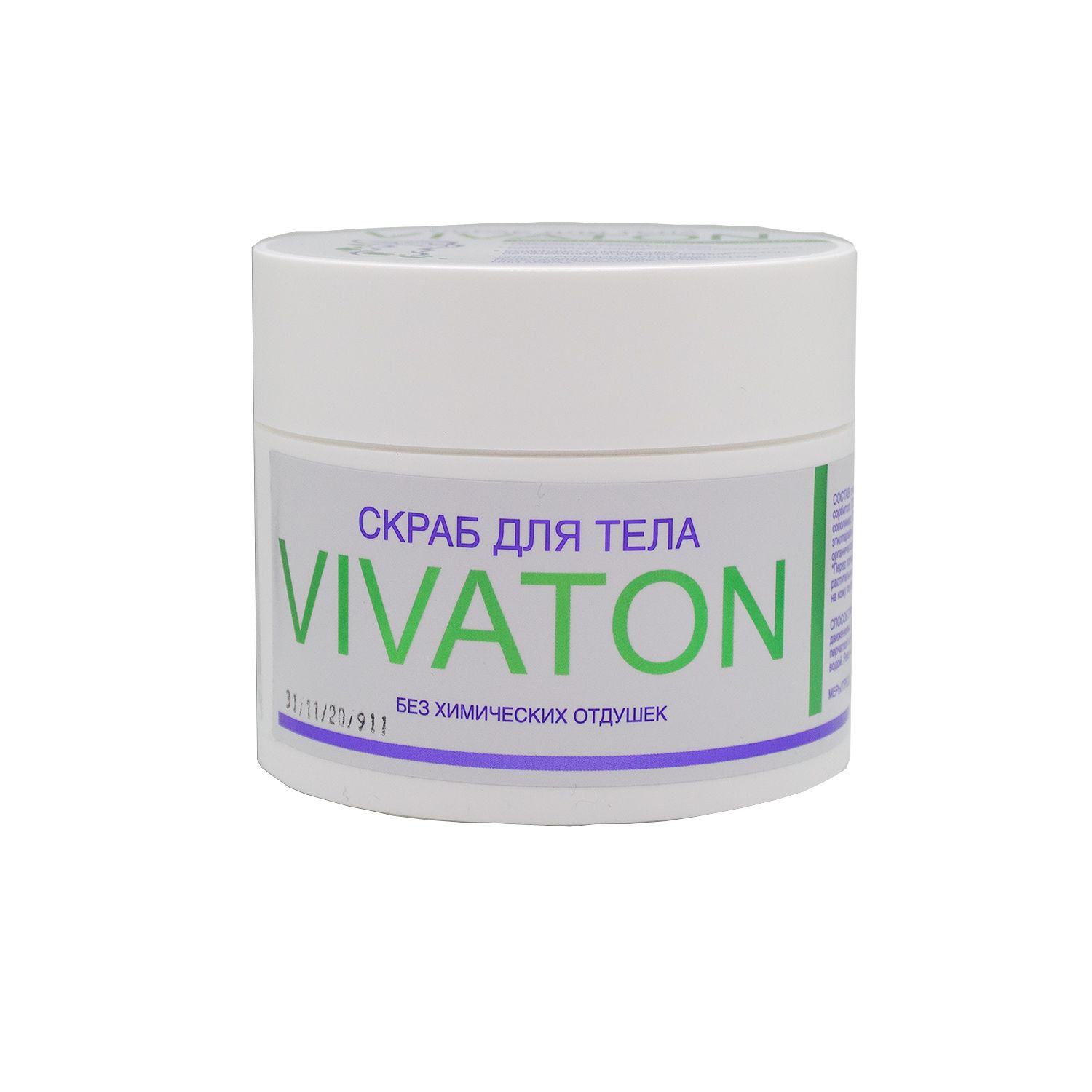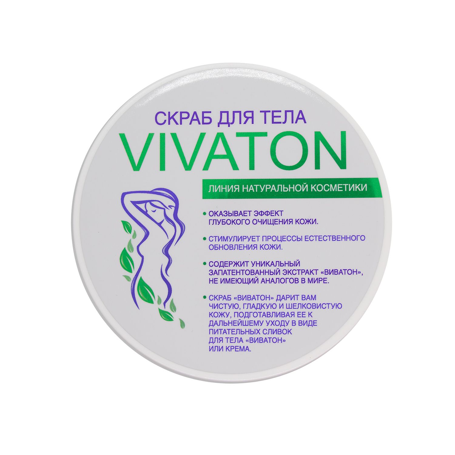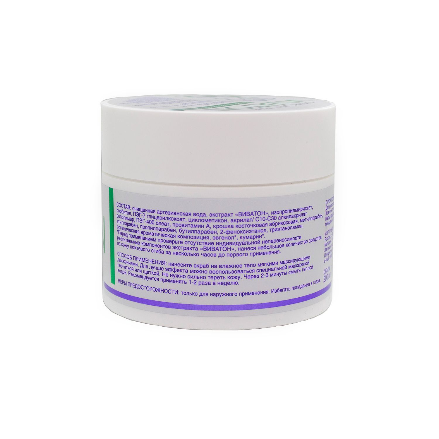 В состав скраба входит экстракт Виватон, который приготавливается с использованием лекарственного растительного сырья и содержит витамины, гликозиды, макро- и микроэлементы, органические кислоты, фитонциды, флавоноиды, эфирные масла и другие биологически активные вещества растительного происхождения, необходимые для питания и ухода за кожей.