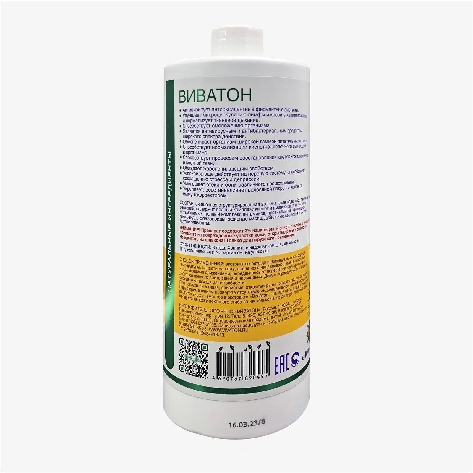 Объем: 1000 мл (1 литр).Состав: Очищенная структурированная артезианская вода, сбор лекарственных растений. Содержит полный комплекс витаминов, провитаминов, аминокислот (в т.ч. незаменимых), фитонциды, глюкозиды, флавоноиды, эфирные масла, дубильные вещества и другие ценные элементы.